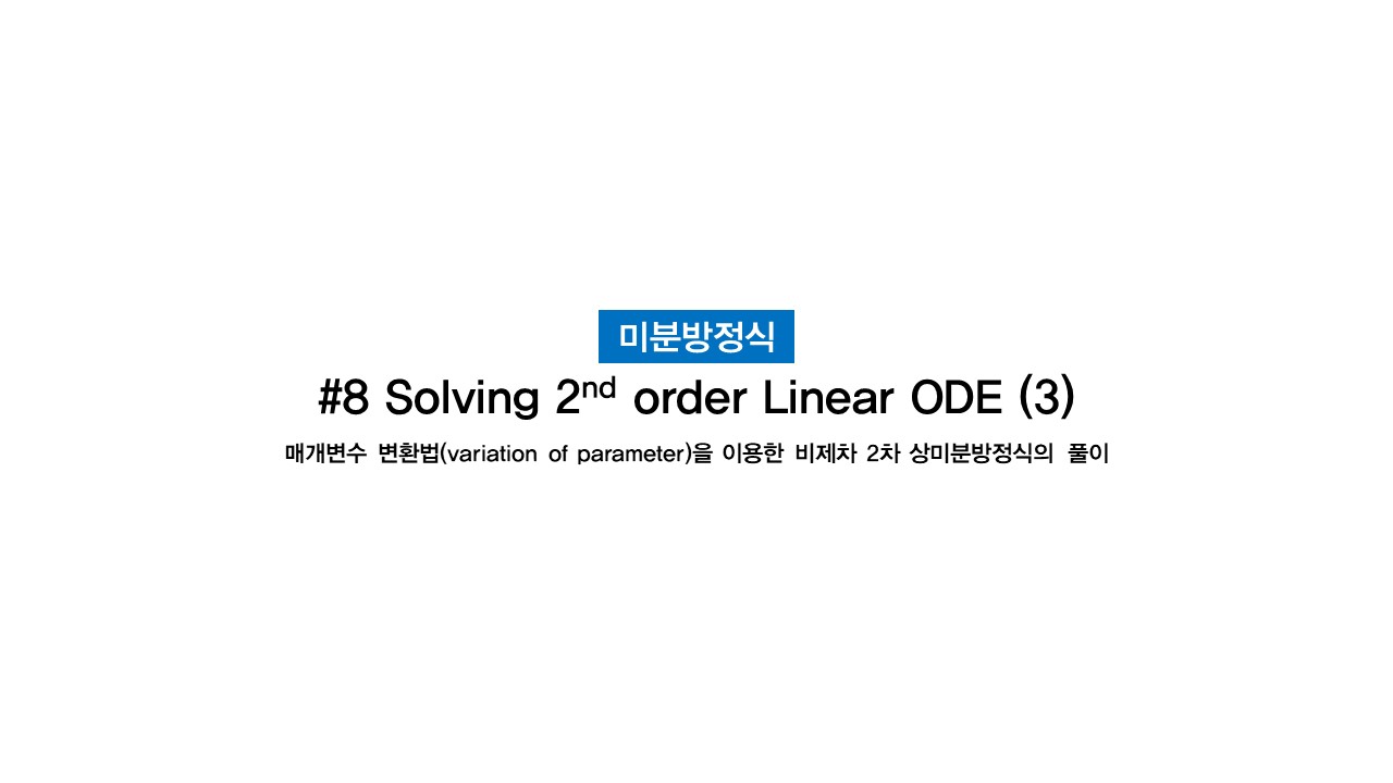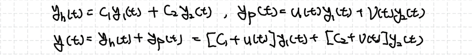 미정계수법은 상수계수를 갖는 2차 ODE를 풀이하기에 좋은 방법이지만, 시간이 비교적 오래 걸리는 단점이 있습니다. 그리고 $y_p(t)$의 형태가 $y_h(t)$에 포함되어 있는지도 해를 구하기 전에 미리 예측해야 하는 번거로움이 있습니다. 이러한 문제점들을 보완하기 위해 매개변수 변환법(method of Variation of Parameter)을 이용할 수 있습니다.