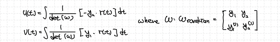 즉, 주어진 미분방정식이 제차 ODE일 때 얻은 해의 기저들의 계수를 하나의 변수로 두고, 이를 풀이해서 $y_p(t)$를 얻는 것입니다. 각각의 매개변수 계수 $u(t)$와 $v(t)$는 다음과 같습니다.