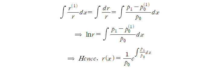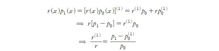 $r(x)$를 결정하기 위해서 변수분리법을 이용할 것입니다. 이를 위해서 좌측항에는 $r$에 대한 식을 우측항에는 $p(x)$에대한 식을 모아 정리했습니다. 적분을 마저 진행하겠습니다.