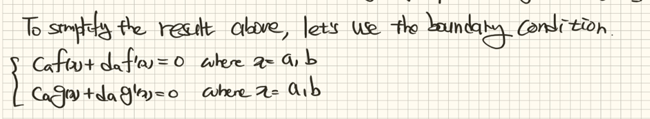 만약 두 내적의 차가 0이였다면 우리는 바로 증명을 마칠 수 있었을 것입니다. 하지만 어떠한 값들의 조합이 결과로 나온 것을 확인할 수 있습니다. 이를 소거하기 위해서 우리는 경계조건(boundary condition)을 확인해야 합니다. 우선, 일반적인 제차의 경계조건(homogeneous Boundary Condition을 설정해보겠습니다.