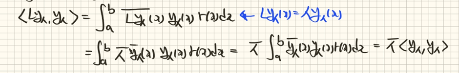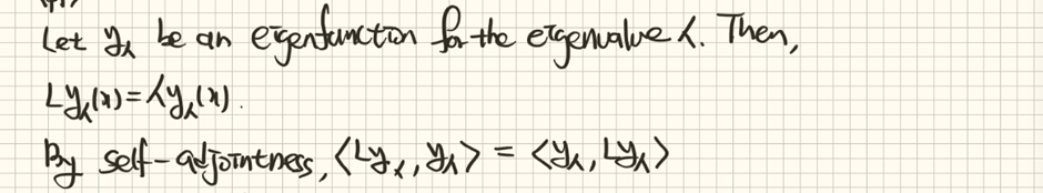 같은 고유함수(eigenfunction)에 대한 내적 결과는 0이 될 수 없습니다. 그렇기에 고윳값과 그 켤레의 형태가 같아야만 자기수반성이 설명됩니다. 어떠한 값과 그의 켤례형태가 동일하다는 것은 해당 값이 실수(real)임을 의미합니다. 따라서 스트룸-리우빌 연산자에 대한 고윳값은 항상 실수인 것을 알 수 있습니다.