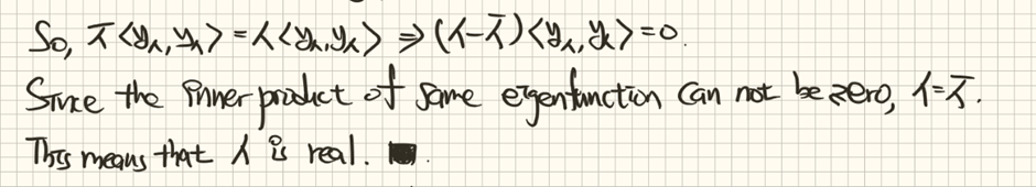 우리가 보이고자 하는 고윳값은 위의 관계에서 확인할 수 있습니다. 이 문제를 풀어서 얻은 고윳값이 실수라는 것을 뜻합니다, 이제 증명을 시작하겠습니다.