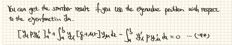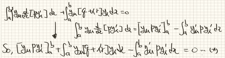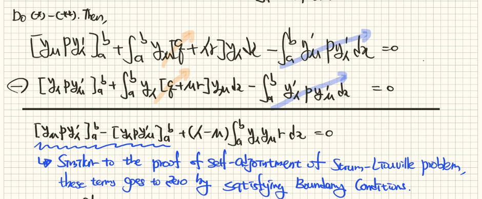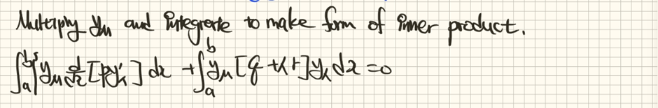 위의 증명은 고윳값 문제 관계를 이용해서 고유함수의 직교성을 증명한 것입니다. 내적을 전개하고, 식을 변형해보면서 직교성을 다시 한 번 증명해보도록 하겠습니다.