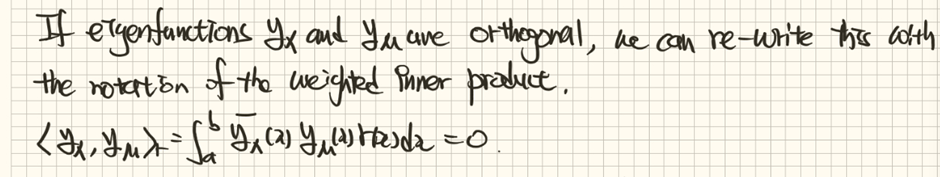 고윳값 문제를 해결하면 고윳값과 이에 해당하는 고유함수를 구할 수 있습니다. 연산자의 종류에 따라 고유함수의 특성이 달라지는데, 에르미트 연산자에 대한 해는 서로 직교하는 특성이 있습니다. 앞서 스트룸-리우빌 연산자의 자기수반성 증명을 통해 이 연산자도 에르미트 연산자로 생각할 수 있으며, 그렇기에 스트룸-리우빌 연산자의 해도 서로 직교할 것이라고 예상할 수 있습니다. 이를 간단하게, 그리고 실제 내적을 통해 식을 조정해보면서 증명해보도록 하겠습니다.