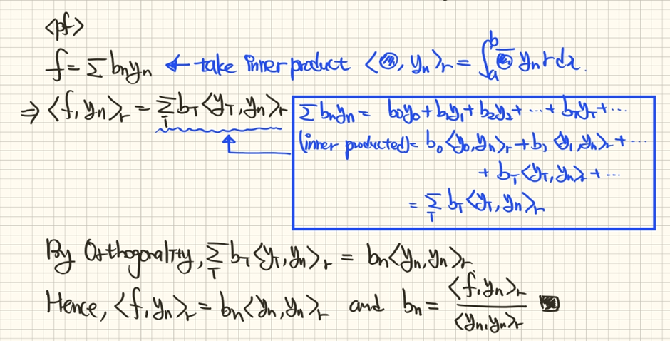 고유함수의 선형조합으로 경계조건을 만족하는 함수를 표현할 수 있고, 내적을 이용해서 고유함수의 계수를 결정할 수 있습니다. 이 특성을 증명해보겠습니다.