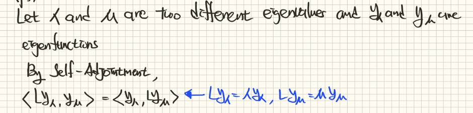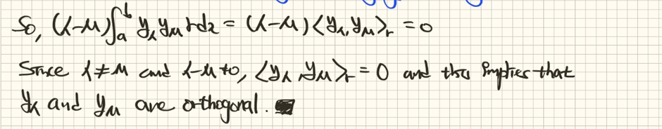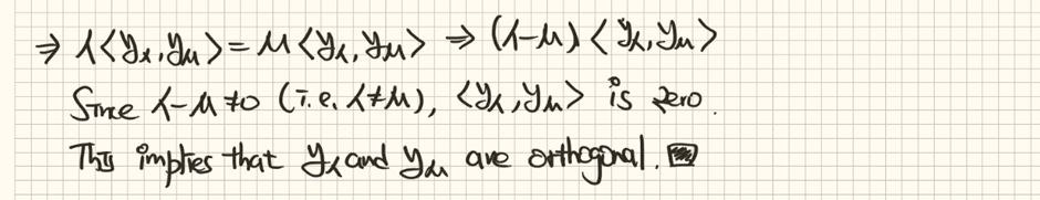 두 고윳값은 서로 다르기에 내적의 결과가 0이 되어야 합니다. 이는 결국 두 고유함수가 서로 직교함을 의미합니다.