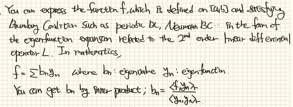 한편, 고유함수의 직교성을 이용하면 경계조건을 만족하는 함수를 고유함수의 선형조합으로 표현할 수 있습니다.