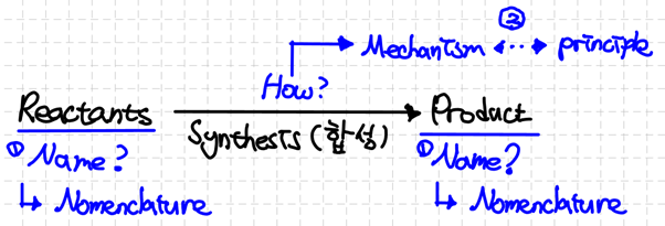 조금 더 확장하자면, 어떤 물질을 준비하는 과정도 마찬가지로 메커니즘을 이용해서 설명합니다. 즉, 우리가 구하기 쉬운 물질로 반응에 필요한 반응물을 합성하는 메커니즘과 해당 반응물이 실제로 반응을 진행해서 기대했던 생성물이 나오는지에 대한 메커니즘을 분리해서 공부하시면 도움이 될 것입니다.