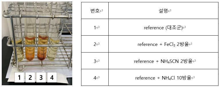 이때 증류수 10mL에 0.5M $FeCl_3$ 한 방울 섞은 용액과 증류수 10mL에 1M $NH_4SCN$ 한 방울을 넣은 용액을 섞어 20mL 혼합 용액을 만들고. 이들을 4개의 시험관에 나누어 담는다. 하나는 비교를 위해 아무런 용액을 넣지 않으며, 나머지 시험관에 실험에서 지시한대로 ②~④ 용액을 넣는다.