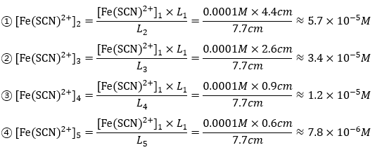 * 표준 용액에서 보두 착이온으로 반응했다고 가정했으므로 한계반응물 $SCN^-$이 $Fe(SCN)^{2+}$로 모두 전환되었다고 볼 수 있다.