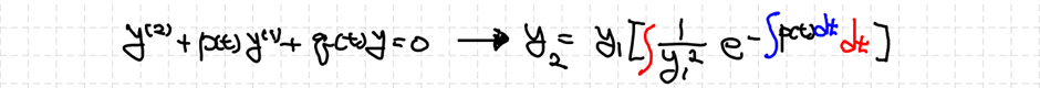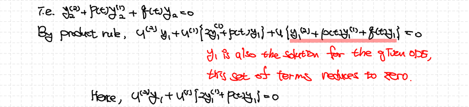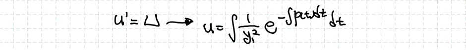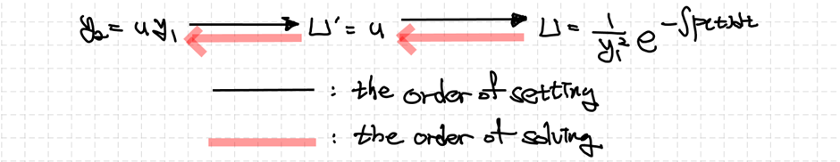 이때 정리된 식에서 우리가 풀어야 하는 것은 $u$입니다. $y_1$은 이미 계산된 해이기 때문입니다. 하지만 우리는 아직 1차 ODE만 풀 수 있기에 $u’$을 치환해서 식을 계속 풀어나갈 수 있습니다.