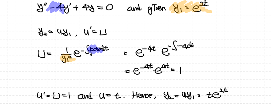 해당 2차 ODE를 풀면 $y_1$만 얻게 됩니다. 그렇기에 차수축소법을 이용해서 $y_2$를 구한 것입니다. 새로 구한 해가 미분방정식의 해가 될 수 있는지 알고 싶으면 이를 다시 대입하면 됩니다. 그 과정은 다음과 같습니다.