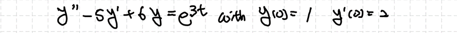 위의 예시에서 $r(t)$만 $e^{3t}$로 바꾼 문제입니다. 하지만 이 forcing function은 $y_h(t)$에서 이미 등장하는 형태입니다. 그렇기에 아무리 $y_p(t)$를 결정하더라도 결국 $y_h(t)$에 흡수되어 제차 상미분방정식에 대한 해 밖에 얻지 못합니다. 따라서 $y_p(t)=Ate^{3t}$로 두고 식을 풀어야 합니다.