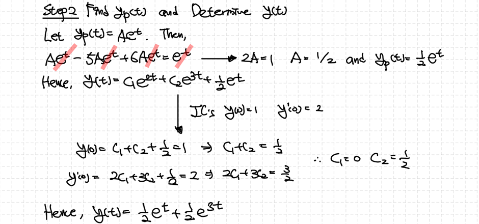 위의 표를 참고해서 forcing function의 형태에 맞게 $y_p(t)$를 설정하고 대입한 후 계수비교를 통해서 형태를 결정합니다.