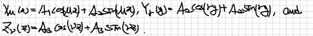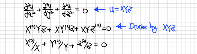 정리하자면, 변수분리법을 통해 식을 정리하면 3차원 편미분방정식이 3개의 상미분방정식을 풀이하는 문제로 바뀐 것을 알 수 있습니다.