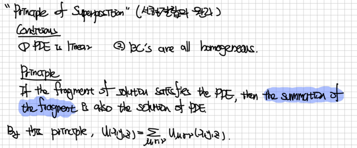 지금까지 변수분리법을 활용해서 편미분방정식을 풀이하는 일반적인 과정에 대해 살펴봤습니다. 각각의 문제에 대해 풀이해야 하는 방식이 다르기 때문에 뒤에서 여러 예시들을 보여드리겠습니다.